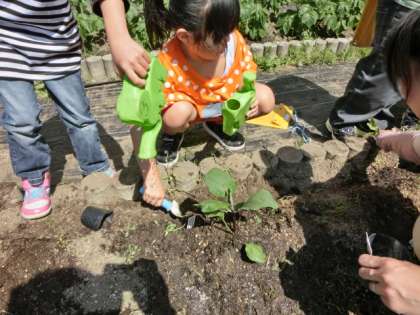 ピーマン・オクラ・キュウリ・ナスをグループに分かれて植えました。