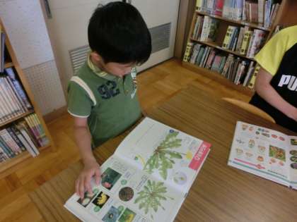 今日の生活科の時間に植えた野菜の育て方の本を探したり、中庭で見つけた虫を調べたり、国語で学習しているたんぽぽについて調べたり…