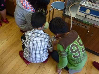 家庭科でおいしいお茶の入れ方を学習し,今週実習をしました。まず最初はガスコンロの正しいつけ方の確認です。1人ずつチェックしました。全員が正しい手順で点火・消火をすることができました。