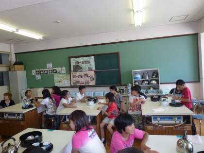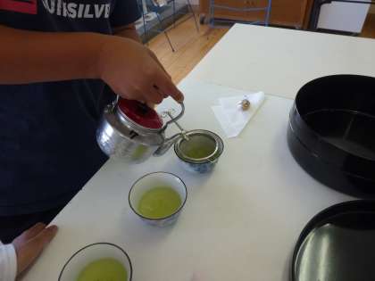次にお湯をわかしてお茶を入れました。一緒に,お客さんにお茶を出す際の作法も知り,グループでお茶を出す人・お客さん役を交代でし,実践しました。その後はみんなでおいしくお茶をいただきました。ほっこりとした楽しい学習になりました。