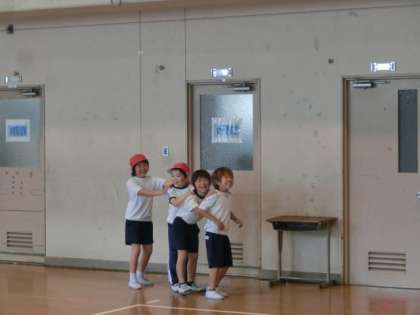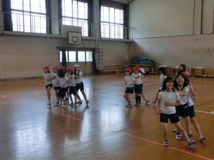前のお友達と息を合わせて,肩を持って,ダンスをしています。