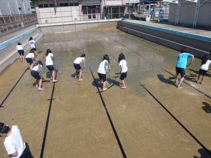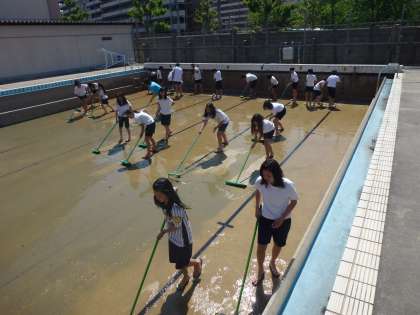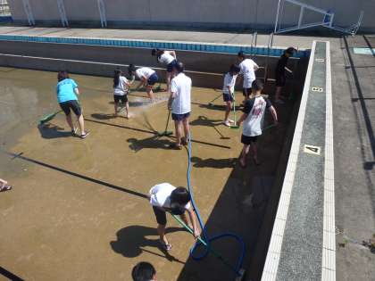 昨年の夏休みに使用してからずっとたまっていたプールの水を抜き,1年間の汚れを6年生が掃除しました。授業で入っているきれいなプールとは違い,たくさんの汚れやごみが落ちていました。子どもたちは,「汚い」,「臭い」などの文句は一つも言わず笑顔で一生懸命掃除に取り組むことができました。