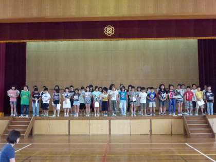 今日は初めて体育館で学芸会の練習をしました。本番通りの並び方や動き方を舞台の上でしました。暑い中2時間続けての練習でしたが,一生懸命頑張りました。体育館の練習では,これまでよりも大きな声が出て,迫力が出てきました。少しずつ自信を持って声を出でるようになってきたなと感じました。明日からの練習も頑張ります!