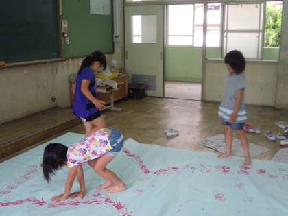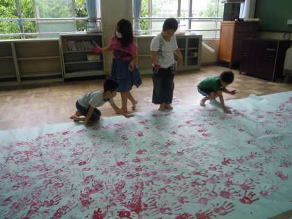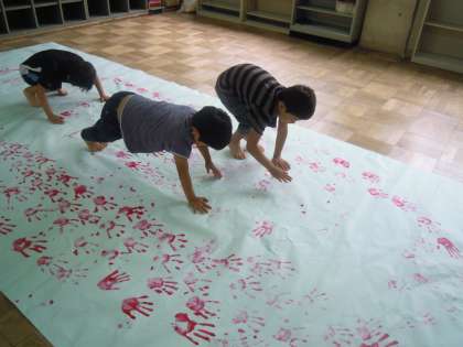 たくさんの赤い魚たちを、みんなの手で表現しました。