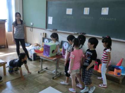 それぞれの形の特徴をつかむために,形あてクイズをしました。ブラックボックスの中に,箱・筒・ボールのどれが入っているか,触って形をあてるクイズです。全員がこのクイズに挑戦しました。どの子も,どきどきしながら箱に手を入れ,にっこり笑って「○○の形です。」と,しっかり答えを言えました。