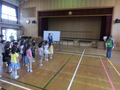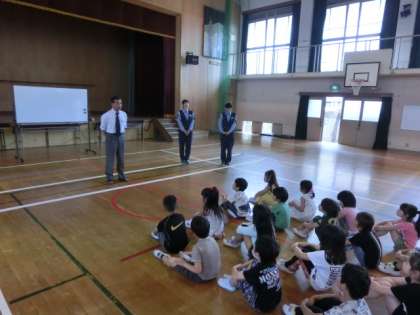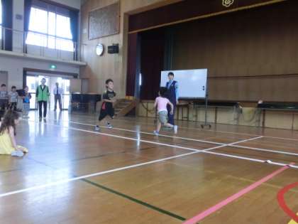 おまわりさんの笛に合わせて何度も練習すると,みんな