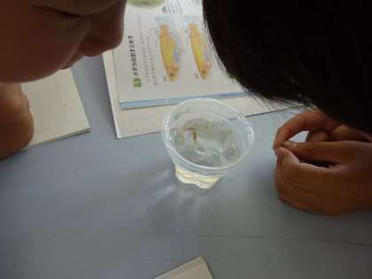 理科でメダカのたんじょうの学習をしています。今日はメダカのオス・メスを見分ける学習をしました。目の前のメダカはオスかな?メスかな?背びれ,腹びれの特徴をじっくり観察しました。