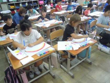 図工の時間は、そんな雨雲を吹き飛ばすために、絵の具で虹の色を塗りました。