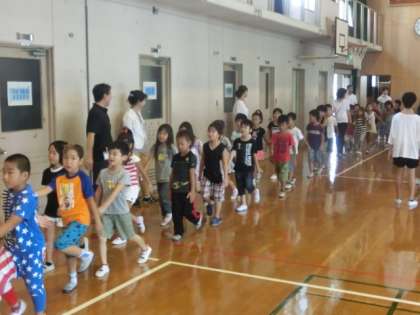 暑い体育館での朝会も,ピシッときれいに並んで