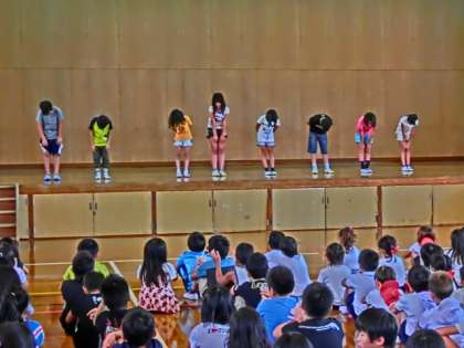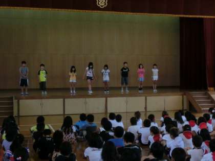 9月9日の朝会で4年生は感動体験発表を全校の前で行いました。