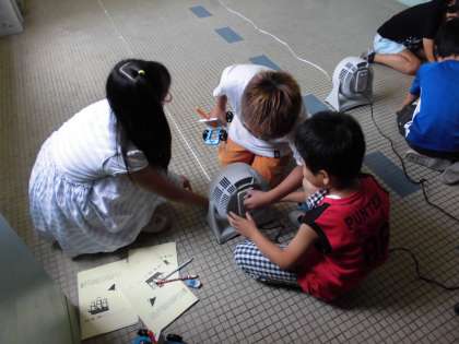 はじめに,強い風と弱い風を当てると車はどのように動くかを予想しました。