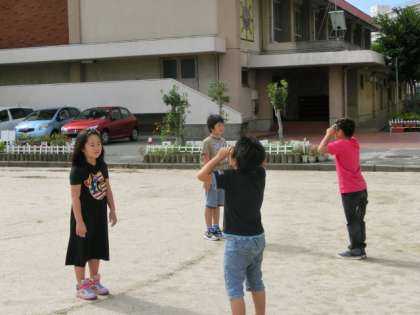 外に出て,遮光版を使って太陽を見たり,かげと太陽の位置関係を調べたりしました。