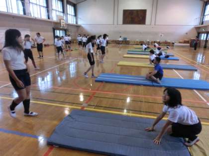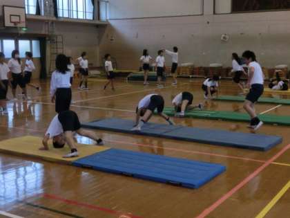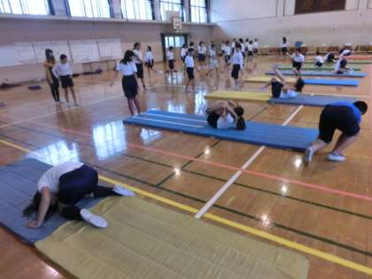 マット運動の学習をしています。5年生では,前転・後転・開脚前転・開脚後転・側方倒立回転・ロンダード・倒立前転・とび前転・前方倒立回転等にチャレンジしています。自分でめあてを持って練習しています。一つできたら積極的に新しい技にチャレンジする姿も見られます。頑張っています。