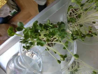 カイワレ大根が大きく成長しました。種をまいてから約10日ほどで大きくなりました。またみんなでドレッシングなどをつけて食べたいと思っています。