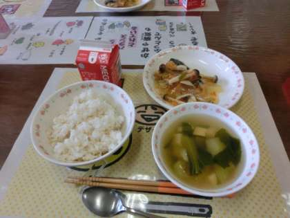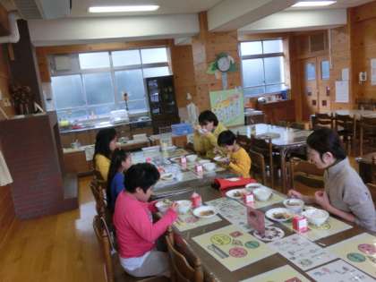 今日の給食は4組のみんなでランチルームで食べました。いつも教室で食べるのとはまた違って、栄養教諭の堀井先生に食材がもつ栄養の話を聞きながら楽しく食べることができました。