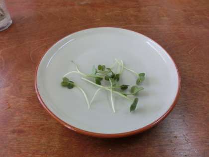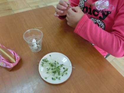 今日は大きくなったカイワレ大根をみんなで食べることにしました。まず、みんなで根本を一本一本切って,湯通ししました。