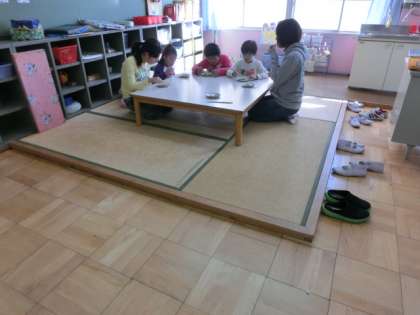 湯通ししたカイワレ大根を畳に座って食べました。カイワレ大根だけで食べてみると,子どもたちは「辛いけど甘い」と言っていました。4組一同野菜のありのままの味をありがたく頂きました。