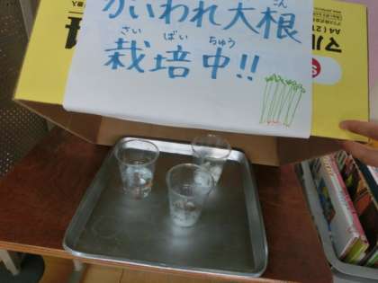 カイワレ大根をおいしく頂いて,次はカイワレ大根の成長について実験をしてみようということになりました。一つ目は成長するために日光は関係があるのか。二つ目は水はかかせないものなのか。三つ目に空気はいるのかを調べてみようと思います。どういう結果になるのか楽しみです。