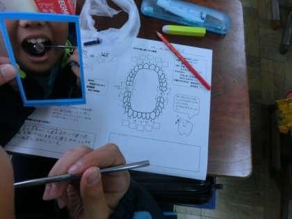 歯の大切さや,磨き方のコツなどを教えていただきました。今回は,歯鏡という道具を使って歯の裏側の様子や磨き残しなどを探しました。