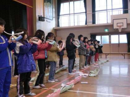 体育館では、「はじめの言葉」「けんばんハーモニカのえんそう」「注意」など、緊張しながら、一生懸命取り組みました。