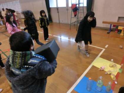 ボーリングコーナーでは、ペットボトルのピンを並べ新聞紙で作ったボールを転がします。点数の合計を出すのに、一苦労でした。