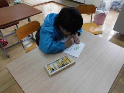 4組の学級目標は,「いつも笑顔で元気いっぱい」に決まりました。今日は,黒板上の掲示物を作りました。クレヨンで一文字ずつ丁寧に書き上げました。