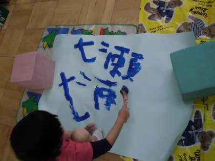 今日は,図工の時間にこいのぼりづくりをしました。大きな模造紙に,手に絵の具をつけて,ぺたぺたとこいのぼりのうろこを表現しました。普段なかなか味わうことのない,からだで絵の具のぬるぬるした感じを味わって,とても楽しそうにこいのぼりのうろこを表現できていました。また,筆でうろこを表現している子どももいました。