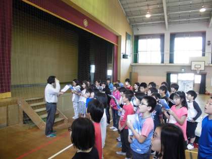 おむかえ集会の練習をしています。体育館で本番に近い形で練習をしています。二部合唱も仕上げです。