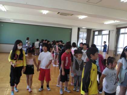 今日は1年生と一緒におむかえ集会の入場の練習をしました。まず,当日一緒に手をつないで入場する1年生と自己紹介をし合いました。その後は行進の練習をし,歌の聴き合いをしました。