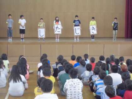 朝会で,3年生の発表や各委員会からのお知らせ,人権のお話などがありました。