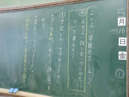 4年生では,国語の学習で「よりよい学級会をしよう」をしています。現在のテーマは,「班当番が欠席したとき,だれが代わりに班当番をするのか」という内容です。子どもたちは,いきいき話し合いの仕方を学習しています。