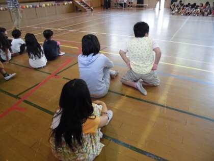 今日は一年生を迎える会がありました。一年生は六年生のお兄さん,お姉さんに手を引かれて入場しました。舞台に上がった時は少し緊張した様子でしたが,お兄さんお姉さんの歌が始まると嬉しそうにしていました。