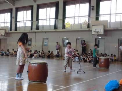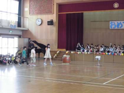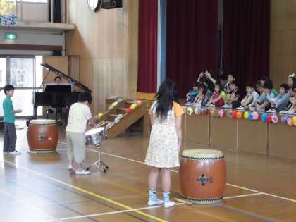 4組もお迎え集会で発表をしました。4組は,太鼓の音で1年生をお祝いしました。先生のピアノに合わせて,リズムに乗りながら楽しく演奏することができました。
