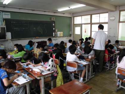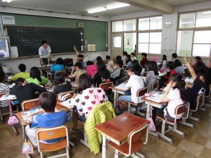 今日は参観日でした。5年生は社会をしました。輪中の人々が水害からのがれるためにしてきた工夫や努力をかんがえました。教科書の写真を見ながら,グループで意見を出し合いながら学習をしました。水害からのがれるために石垣を高く積んむ工夫をしたことや,250年前に侍が川と川が合流しないように間に木を植えた話を聞いたりしました。グループで学習する時間があり,主体的に考えることができたのではないかなと思います。