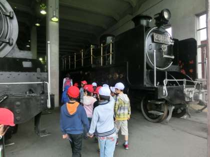 蒸気機関車館では,まずSLに乗りました。汽笛が鳴ると,