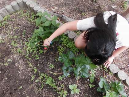以前,植えたイチゴがついにできていました。1つだけでしたが,出来上がっているのを発見した子どもたちはとても嬉しそうでした。このイチゴは包丁で切って,みんなでおいしく頂きました。甘酸っぱくておいしかったです。