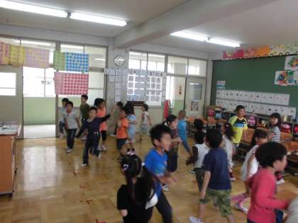 最初の方は,教室の中をスキップしながらリズムに合わせて歌い,