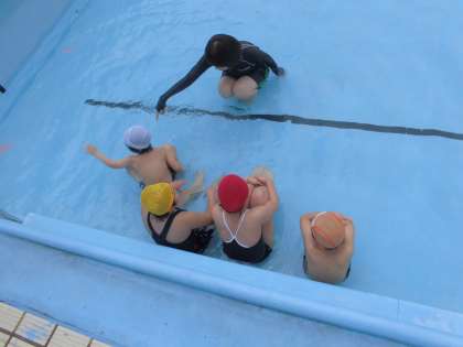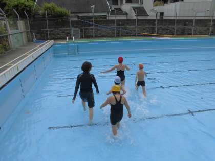 今日から低水位水泳学習が始まりました。子どもたちは久しぶりのプールにとても喜んでいました。今日は水に慣れる運動をしました。水の中を歩いたり,ワニさん歩きをしたりして水に慣れ親しみました。