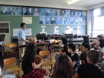 今日も音楽の学習がありました。今,音楽室には鼓笛部が使っている楽器がたくさんおいてあります。今日はリコーダーの練習の前に,それぞれの楽器の演奏の仕方,扱い方等について教えてもらいました。どの楽器にも特徴があり,正しい演奏の仕方を知ることでよりよい音が出るということが分かりました。また運び方,手入れの仕方についても教えてもらいました。授業後にはさっそく教えてもらった通りに楽器をさわってみる子の姿もみられました。興味津々の子どもたちでした。