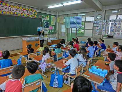 今日は,読書週間の取り組みで出張読み聞かせがあり,山口先生に「へんしん かいじゅう」という絵本を読んでもらいました。