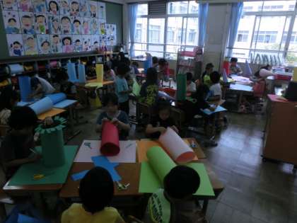 基本のつくりかたを確かめた後は,色画用紙を丸めたり,