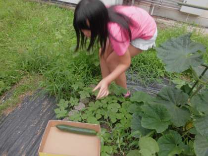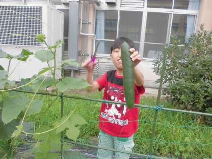 休み明けに畑に出てみると,大きな大きなきゅうりとオクラとズッキーニが出来上がっていました。子どもたちは,それを見るなりとても驚いていました。収穫した野菜は持って帰りました。