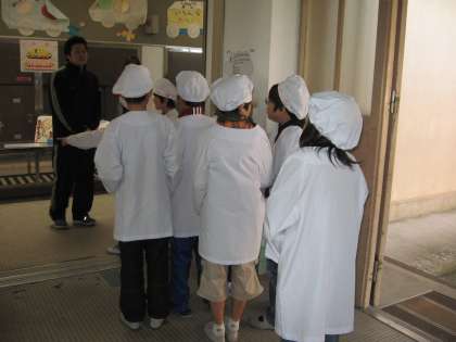 ○ 給食室の入り口で,エプロンを着た当番の子どもたちが「いただきます!」と声を合わせて挨拶します。