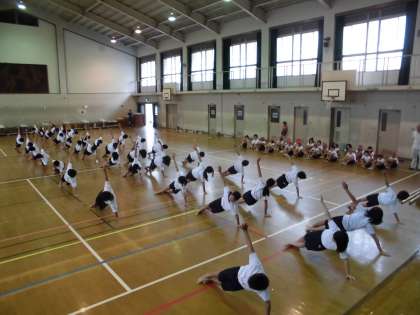 3年生は棒引きと徒競走と玉入れに出場します。練習をしようと体育館に行ってみると6年生がいて,組体操の練習を見せてくれました。3年生の子ども達にとっては目の前で見ることはなかなかありません。個人技ですが6年生の息の合った演技に目をキラキラさせていました。3年生の子どもたちが組体操をするのはまだ先ですが,今年の運動会がとっても楽しみになった様子でした。