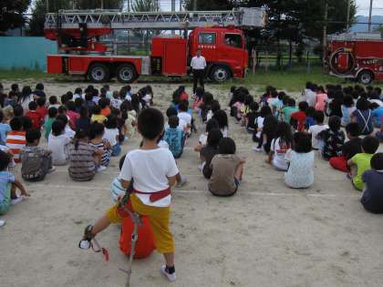 今日は,家庭科室で火災が発生したという想定で避難訓練をしました。子どもたちは,ハンカチを口にあてて落ち着いて運動場に避難することができました。その後,消防署の方から火遊びをしないといった注意するべきことのお話がありました。日頃から注意してほしいと思います。