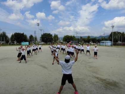 先日,騎馬戦の前に準備体操の練習をしました。「おどるポンポコリン」の曲に合わせて体操をします。前に準備体操係が立ち,その真似をしながら練習しました。初めてにもかかわらず,上手に体操を行っている子がたくさんいました。また,曲に合わせて楽しそうに体操を行うことができていました。