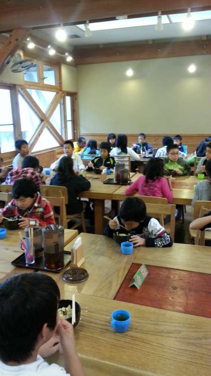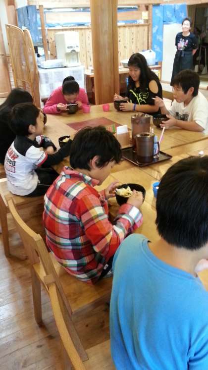 今日の昼ごはんは地鶏卵丼でした。だしの味がきいていて、とてもおいしく、おかわりをする子どもたちもいました。