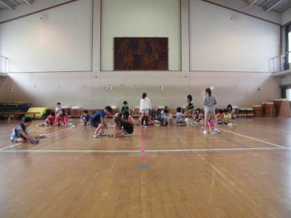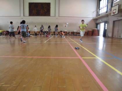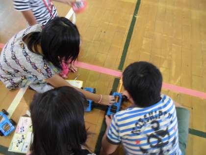 子どもたちはグループに分かれて,上手にまきじゃくを使って発射台からスタートさせた車の移動距離を測りました。