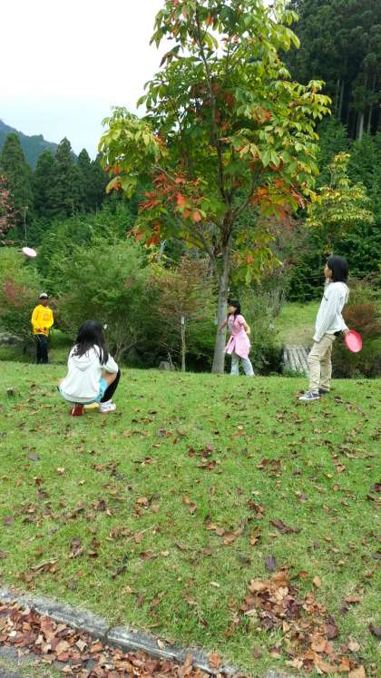フライングディスクゴルフをしました。できるだけ少ない打数で入れられるように工夫した投げ方をしたりして、楽しんでいました。