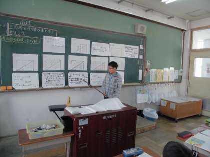 算数の授業では「面積」の学習を行っています。4年生の学習で長方形や正方形の面積を求める方法は学んでいます。5年生では三角形の面積を求める方法を考えます。既習事項を使い,解き方を考え,最後にグループごとに発表しました。